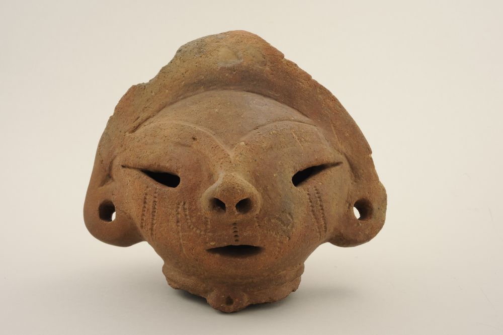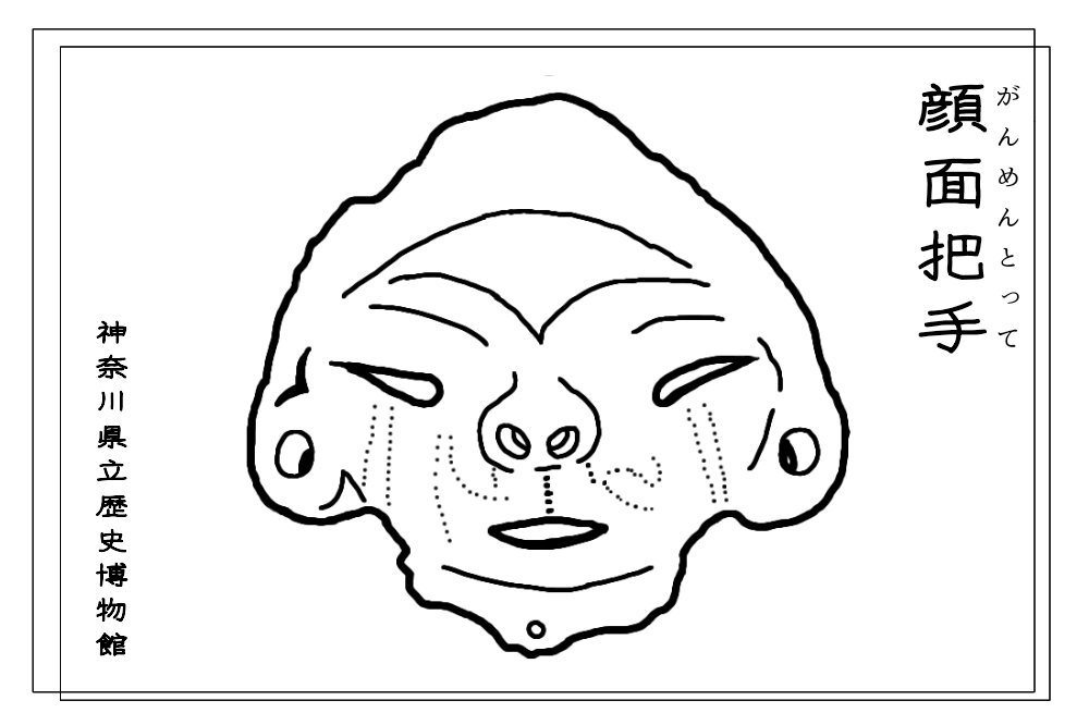 今から約5000年前に作られたぞ。つりあがった目尻やちょこんと上を向いた鼻など、独特でなかなかかわいい顔じゃな。この頃、関東地方西部や山梨県・長野県のあたりではこういった特徴をもつ「あたま」の形の土器が多く作られたんじゃが、当館のこの「あたま」はその中でも最大級じゃ。残念ながら首から下が失われていてのう、全体でどのような姿だったのかよく分かっておらんのじゃ。研究者たちの説は、縄文土器の縁につけられた装飾という考えもあれば、人型の体を持った土偶という考えもある。おぬしならこの「あたま」の下はどうなっていたと思うかのう? 考えながら色ぬりにチャレンジじゃ。