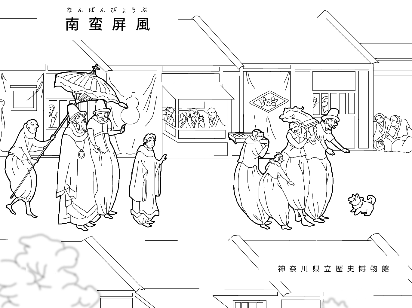 今から約400年前に作られた屏風じゃ。屏風は和風のパーテーションみたいなものじゃな。おひなさまの後ろに飾るのを見た事があるかもしれないのう。日本は昔、鎖国(さこく)と言って海外から日本に来ることを制限しておったんじゃが、そうなる前にポルトガルやスペインから商人やキリスト教を伝える宣教師がやってきていたんじゃ。そのときの様子を描いているぞ。昔の人たちがどんな服を着ていたか、どんな街並みか、想像してぬってみてくれ。