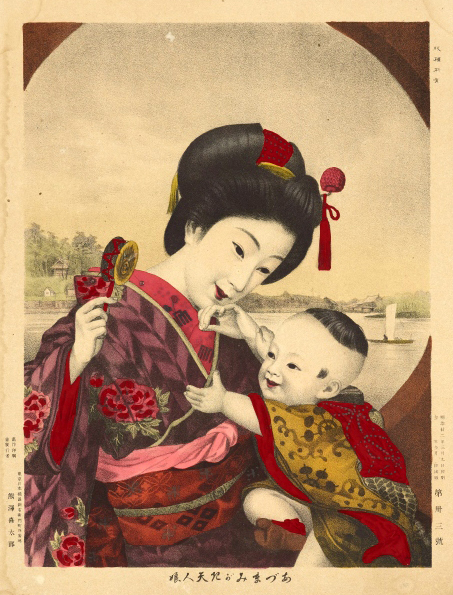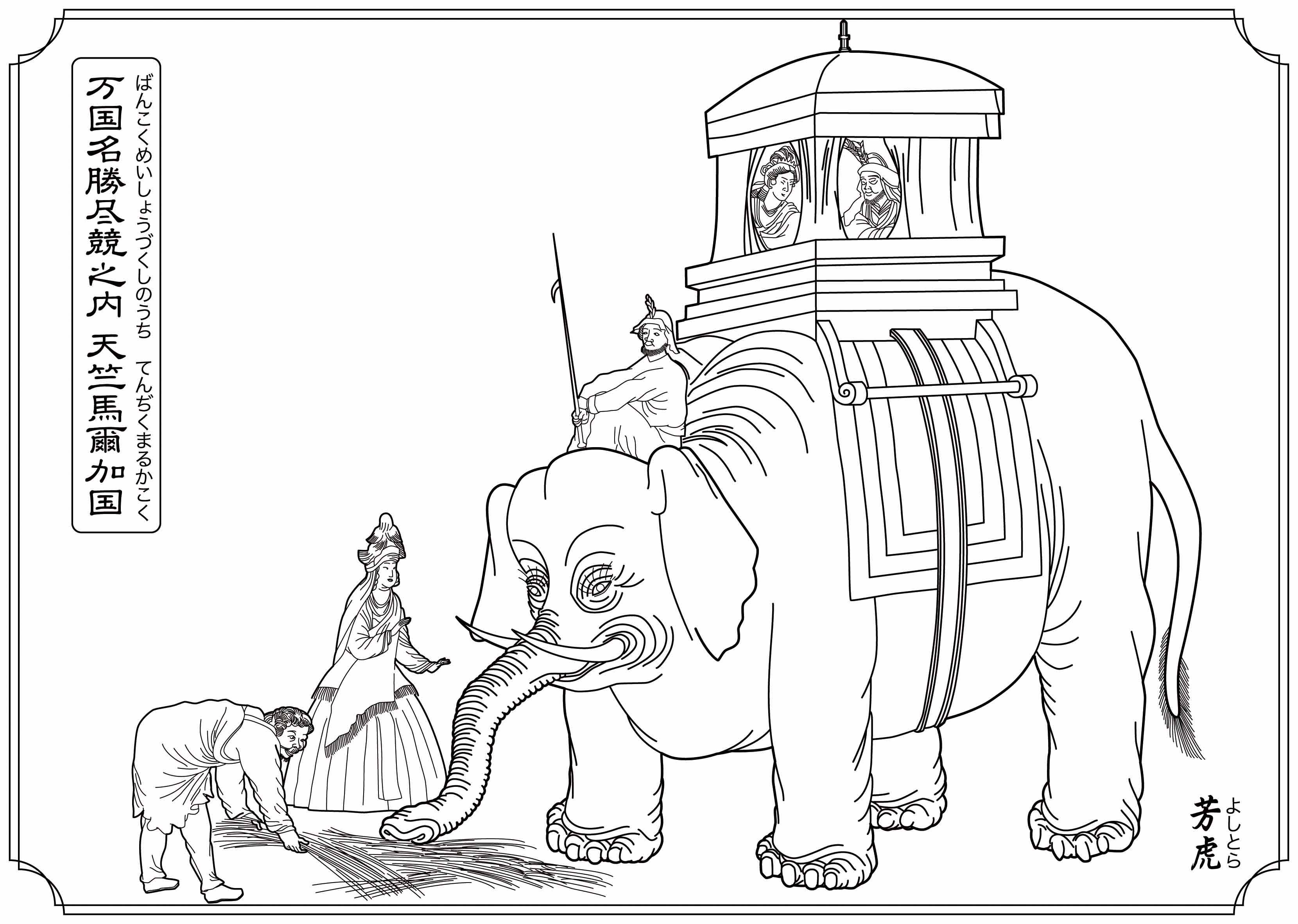 近代の石版画資料のぬりえじゃぞ。明治時代、日本には西洋文化が一気に入ることになるんじゃ。その中のひとつが石に原画を描く石版画で、江戸時代からつづく浮世絵などの木版画(この版画は皆も学校などでやったことがあるかもしれんな)の技術にプラスして、新しく石版術や写真術などが伝わったのじゃ。それにより、様々な印刷物が出版されていくようになるぞ。細かいもようや髪の毛の表現など、細部にこだわってぬってみてくれい。