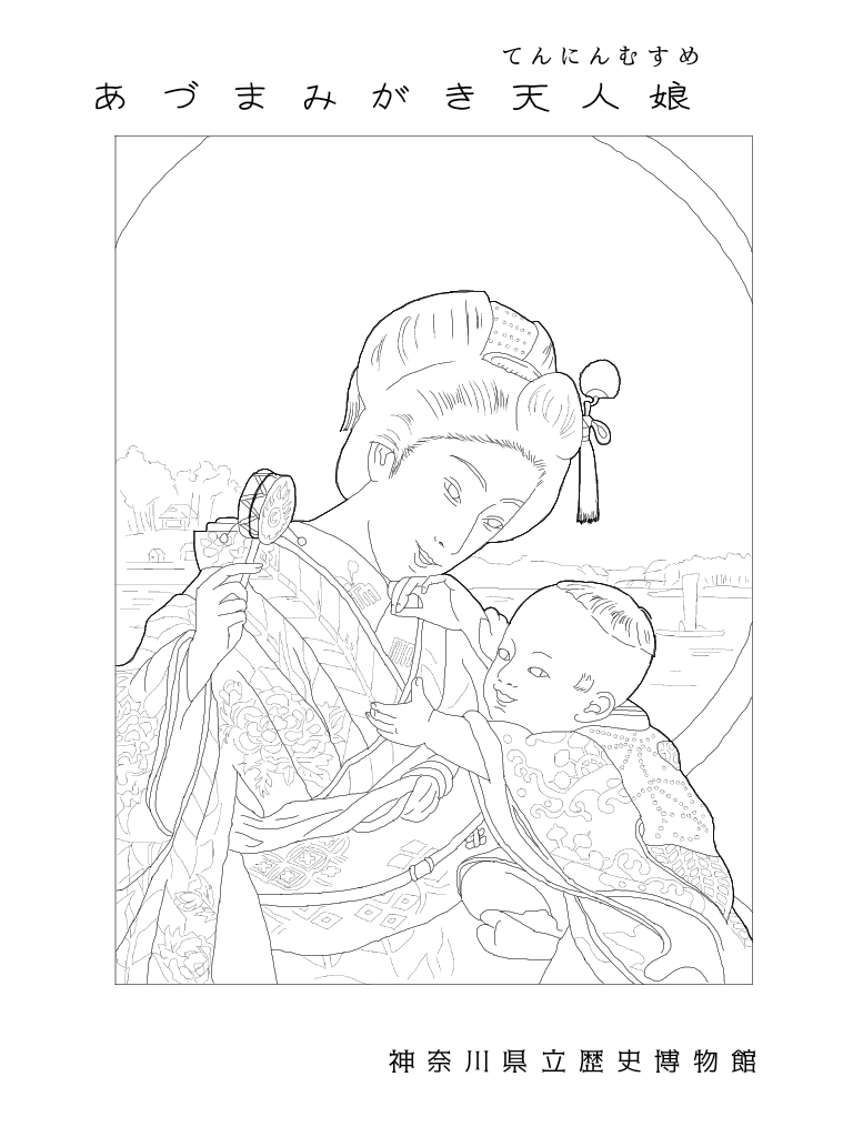 昨年(2019年)開催した「横浜浮世絵」展にも出品された浮世絵が元となったぬりえじゃぞ。「横浜浮世絵」は幕末から明治時代にかけて作られたんじゃ。開港をきっかけに、様々な新しいものが描かれたぞ。例えば、外国人がたくさんいる横浜の街、来日した外国人たちの容姿や生活、洋風に整備された日本、人の目に触れることのほぼなかった海外などなどじゃな。元の資料もたくさんの色が使われ、とてもきれいじゃが、おぬしだったらどんな色を選ぶかのう?