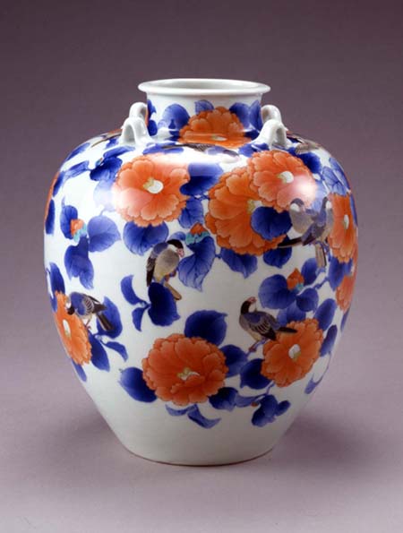 色染付椿ニ文鳥花瓶(いろそめつけつばきにぶんちょうかびん)【令和2年4月28日公開】