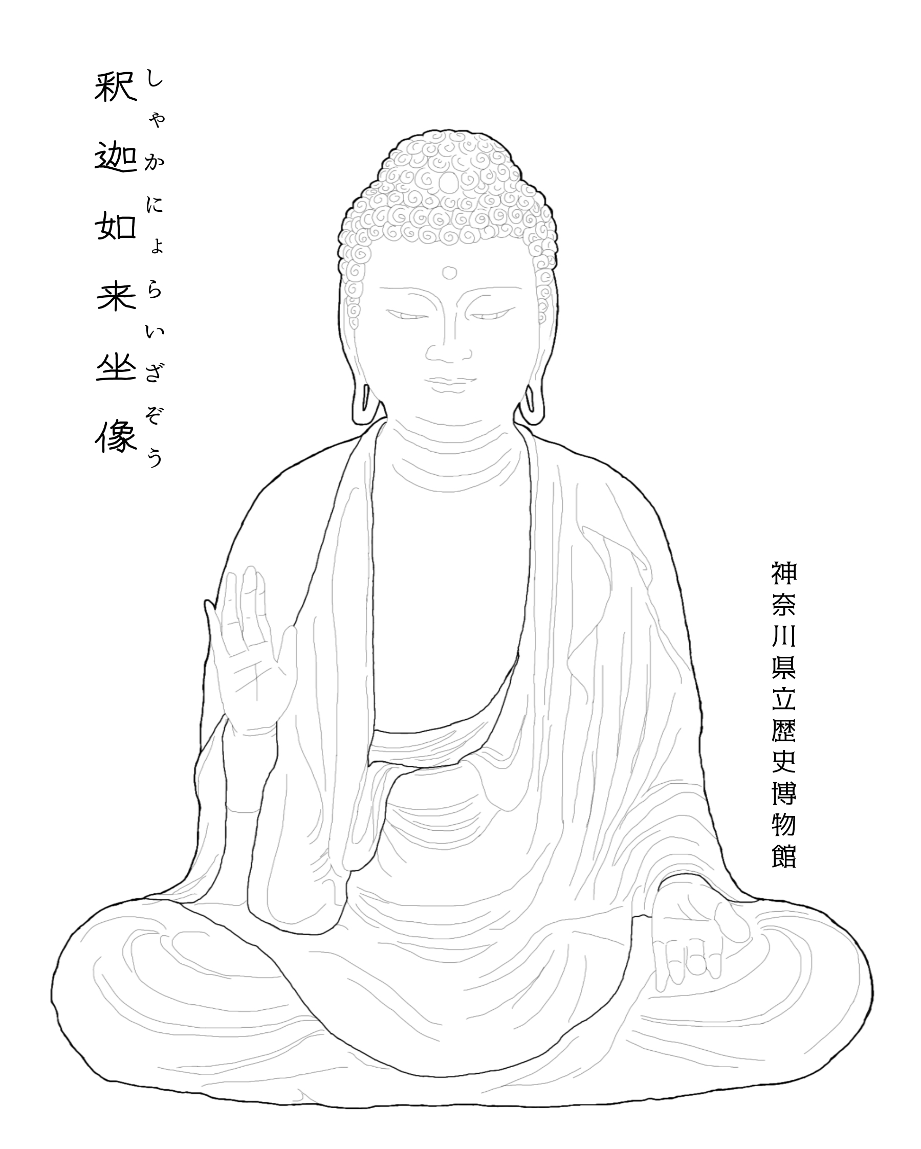 釈迦如来という仏様の像じゃぞ。「お釈迦様」という言い方もあるのう。もとはインドの王子様だった人なんじゃ。仏像は顔や頭に目が行きがちじゃが、今回注目してほしいのはその服じゃぞ。インドやその周辺の国のお坊さんは今もこれに近い服装をしているが、どこがどのように重なっているかわかるかのう?この仏像は4枚の布をうまく重ねてまとっておるんじゃ。どこがどう重なっているのか、よく見ながらぬってみるとよいぞ。
