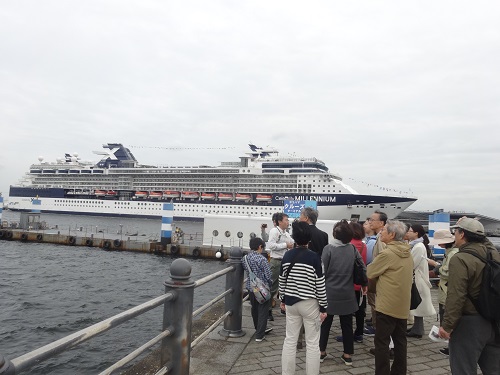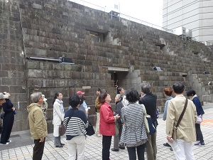赤レンガ倉庫の後は、港湾石積み・汽車道のお話などをしながら、今度は1号ドック(旧横浜船渠株式会社第一号船渠)へ。現在日本丸が停泊している1号ドッグは実は現役の船舶のドックとして使用可能です。その後はすぐそばの2号ドック(旧横浜船渠株式会社第二号船渠)も見学しました。これらの港湾遺構の共通点に、神奈川県産の石が多く使用されていることがあげられます。横浜正金銀行本店とのつながり、横浜の近代建築の成り立ちを感じることのできる見学会となりました。