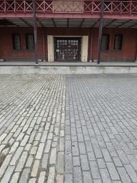 後半の港湾遺構見学は、まず赤レンガ倉庫(旧新港埠頭煉瓦一号上屋・旧新港埠頭煉瓦二号上屋)を目指し歩きます。赤レンガ倉庫には開港当初に整備された床タイル部分が残っています。よく見ると、古い石組みと新しい石組みは一目瞭然。