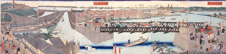 五雲亭貞秀「横浜鉄橋之図」「横浜鉄橋其二」は、右の3枚には「横浜鉄橋之図」、左の3枚には「横浜鉄橋其二」とそれぞれタイトルが記され、検閲を受けた月も異なります。したがって本来は2つの作品としてみるべきなのでしょう。しかし、主役の鉄橋は右から4枚にまたがっていて、画面は自然につながります。そのため、現在では大判錦絵6枚続の作品とみなされています。