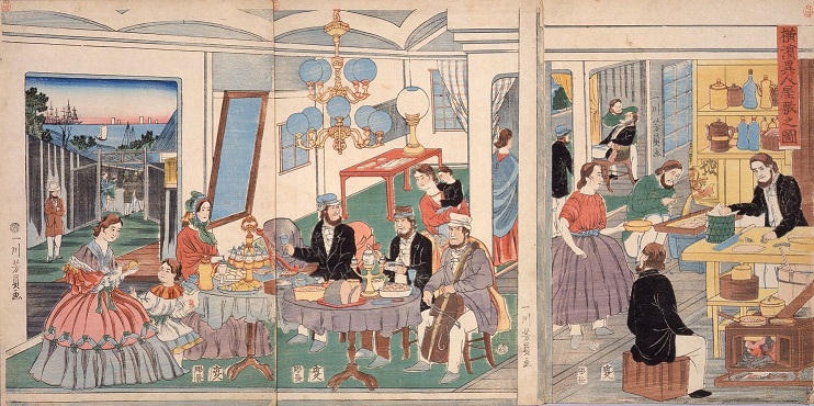 一方、一川芳員「横浜異人屋敷之図」は開港から2年経たない頃に出版された、外国人の邸宅内部を描いた浮世絵です。左手に食卓を囲む外国人、右にはその食事の支度をする人々、奥にはひげをあたられている男性もいます。洋食器、チェロ、シャンデリア、調理用のかまど、もちろん、外国人男女の装い、などなど。描かれたモノはこれまでの浮世絵には描かれない、つまり見たことのないものであったでしょう。